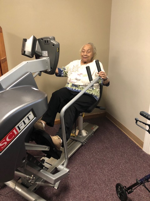 Martha Rogan was the first resident to try out the new equipment. She could not be happier with this donation, as she tested out the bike with a huge smile on her face. The Champaign Family YMCA trainer Jen Post has volunteered her time to visit Messiah in March to train any residents interested in using the equipment to fit their personal need.